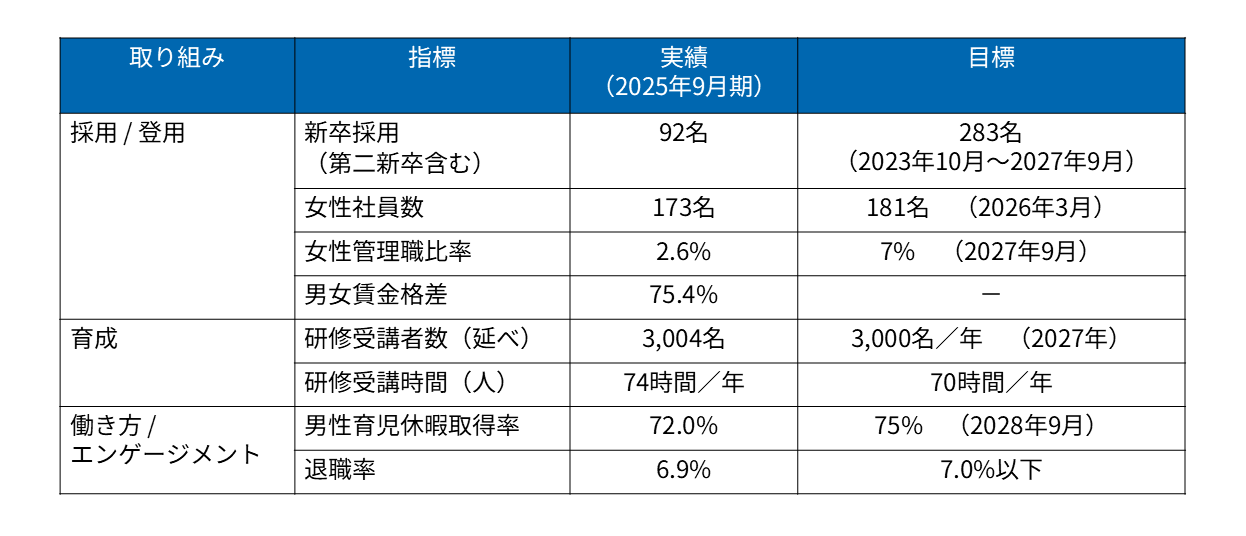 当社では、持続的な成長に向けた最重要課題として「人財育成」を推進し、育成に関する方針及び社内環境整備に関する方針について、指標を定めています。取り組みの概要は下記の通りです。
